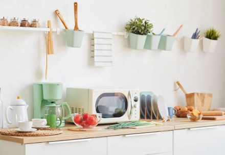 Jeśli zależy nam na stworzeniu w kuchni niebanalnej i kreatywnej przestrzeni, zdecydujmy się na wykończenie ściany farbami tablicową i magnetyczną. Farby tablicowe to najczęściej dyspersyjne wyroby lateksowe lub akrylowe, występują w szerokiej gamie kolorystycznej, mogą być matowe lub półmatowe. Powierzchnia pomalowana farbą tablicową jest odporna na wilgoć. Niestraszne jej wielokrotne zmywanie wodą, a także intensywne rysowanie kredą. Na tak wykończonej ścianie będziemy mogli robić listę zakupów, sprawdzi się też jako ściągawka z wypisanym ulubionym przepisem na potrawę, którą mają wykonać dzieci. Może też pełnić funkcję tablicy informacyjnej dotyczącej planu dnia czy zadań, które muszą wykonać członkowie rodziny. Farba magnetyczna to dyspersyjna farba podkładowa w kolorze szarym – najczęściej akrylowa, lateksowa lub alkidowa. Dzięki bardzo drobnym cząsteczkom żelaza (magnetytu żelazowego) przyciąga magnes. Na powierzchnię pomalowaną farbą magnetyczną można nanieść farbę w dowolnym kolorze, jednak warto zastosować farbę tablicową, co znacznie poszerzy jej możliwości aranżacyjne i funkcjonalne.