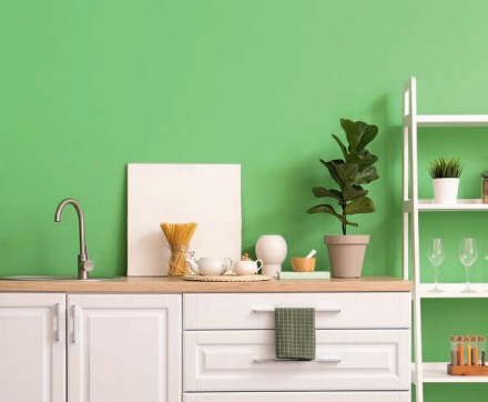 Moda na kolor jasnozielony określany też jako „kolor pączków na drzewach” również nie przemija. Zieleń żółtozielona o nazwie Greenery była kolorem roku 2017, ale stale widzimy ją w dodatkach dekoracyjnych, tekstyliach, elementach wyposażenia wnętrza szczególnie w stylu egzotycznej „urban jungle”. Warto wprowadzić mocną plamę limonki tam, gdzie zależy nam, by przestrzeń była świeża, żywa, optymistyczna i przyjemna dla zmysłów. W kuchni doskonale sprawdzi się jasnozielona boazeria, szyba nad blatem kuchennym czy fototapeta z soczystą zieloną roślinnością. Barwa ta będzie doskonale kontrastowała z meblami w kolorze białym, szarym czy czarnym, ale także pięknie skomponuje się z naturalnym drewnem. W salonie na tle ściany w kolorze limonkowym sprawdzi się szara lub beżowa sofa. Farby możemy spotkać pod różnymi nazwami, np. limonkowy jak się patrzy, ale też budzącymi skojarzenia dość odległe, np. bambusowy gaj.